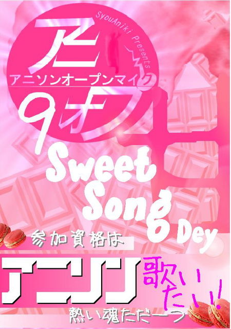 〜小アニキ・プレゼンツ〜 『第九回アニソン・オープンマイク Sweet Song Day』咆哮開催! 2月10日(金) OPEN 19:00 START 20:00 ☆参加条件☆ ※それは『アニソンを歌いたい!』という熱い魂!! 【重要】 ※そして2月テーマはバレンタイン直前という事で 去年とほとんど一緒ですが2曲中1曲は、、 ”甘くスウィートなアニソン!を宜しくお願い致します。 ☆募集要員☆ ※10組 ☆場所☆ Cafe Dolce Vita (HP)http://www1.to/dolce-vita ☆参加者☆ チャージ\500+2オーダー ※リスナー無料 (2オーダー制) ☆出演