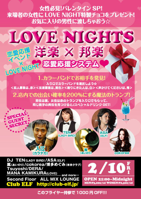 2月10日渋谷ELF(エルフ)にて 超豪華なゲストが出演で金曜日渋谷一の盛り上がりを見せる FLFの「PARTY FRIDAY」 毎月第2金曜開催 LOVE NIGHT http://mixi.jp/view_community.pl?id=4262043 邦楽VS洋楽 毎回1000人越えのラブビートの姉妹イベント週末バージョンです !! 今回はバレンンタインスペシャル 来場者の女子にLOVE NIGHT特製チョコを配ります 中でお気に入りの男性に渡しちゃおう 入り口で4種類のカラーバンドを選択 してもらっての入場