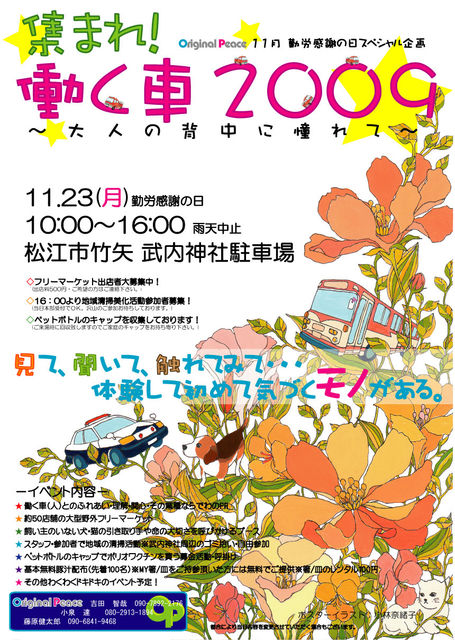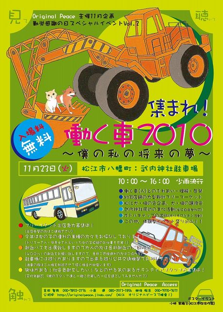 皆さんいかがお過ごしでしょうか イカは島根町辺りでは大量に干されていますぐわっしゅw (脱線したこと、イカらないでね) さてさて、本題に入ります。。。 我々Original Peaceのメイン活動の一つに『集まれ!働く車』シリーズがあります過去2回大盛況で続けてきたこのイベントは去年11月23日には沢山の方々に惜しまれながらも苦渋の決断で開催を見合わせましたね あれから半年・・・ 幾度となくミーティングを重ねて決断いたしました 今年5月20日(日)パワーアップして再びこの松江の人たち