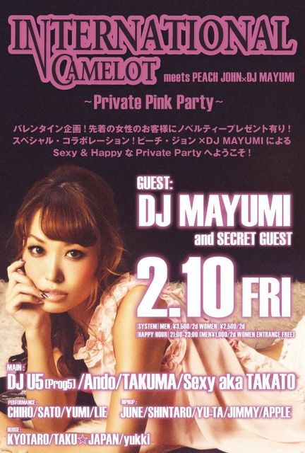 2/10(金) International Camelot meets Peach John x DJ Mayumi Open: 21:00 System: Men ¥3500/2D / Women ¥2500/2D Happy Hour 21:00~23:00 (Men ¥1000/2D / Women Free Entrance) Guest: DJ Mayumi Main DJ: U5 (Prog5) / Ando / Takuma / Takato aka Sexy Performance: Chiho / Sato / Yumi / Lie Hip Hop DJ: June / Shintaro / Yu-Ta / Apple / Jimmy / Wai-Hang House DJ: Kyotaro/ Taku☆Japan / Yukki Main フロアはインターナショナルなオールミックスでお届け♪ 女性にも人気のHip Hop, R&Bな