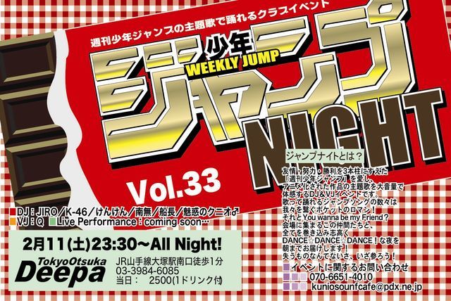 “ジャンプナイト”は一晩ジャンプ楽曲づくしのお祭りです。 内容、興奮度共に、 最高テンションを続け2012年も探し物探しに行くのさ! いつもの皆さん、そしてもちろんはじめてご参加の方も大歓迎ですよ。 今回もお誘い合わせの上、ご予定頂けます様よろしくお願いしますね! ☆ご参加の方はこちらも是非一度読んでみて下さいね! http://mixi.jp/view_bbs.pl?id=52923068 特集のリクエストも受け付けております! “ジャンプナイトVol.33” 日時:2/11(土)23:30〜All Night! ※終了後も朝から二次会完備! 会場:大塚Deepa
