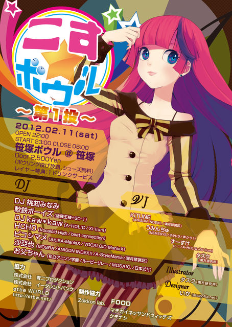 いよいよ明日!!タイムテーブル公開しました!! ※『当日の入場について』、『バレンタインチョコについて』の注意事項を【Q&A】にUPしました!! (2月10日更新) 【前回の様子】 http://www.youtube.com/watch?feature=player_embedded&v=vDt5daAFkaA ----------------------------------------------------------------- 【日時】 2011.02.11(sat) 【時間】 OPEN 22:00〜 START 23:00〜 CLOSE 05:00 【場所】 笹塚ボウル @ 渋谷区笹塚 【料金】 2,500Yen (ボウリング投げ放題、シューズ代無料)