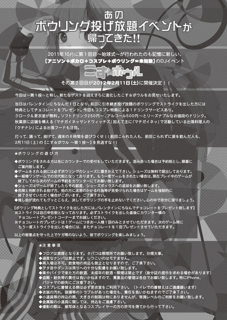 いよいよ明日!!タイムテーブル公開しました!! ※『当日の入場について』、『バレンタインチョコについて』の注意事項を【Q&A】にUPしました!! (2月10日更新) 【前回の様子】 http://www.youtube.com/watch?feature=player_embedded&v=vDt5daAFkaA ----------------------------------------------------------------- 【日時】 2011.02.11(sat) 【時間】 OPEN 22:00〜 START 23:00〜 CLOSE 05:00 【場所】 笹塚ボウル @ 渋谷区笹塚 【料金】 2,500Yen (ボウリング投げ放題、シューズ代無料)