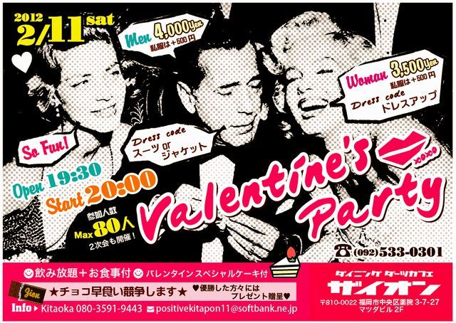 2月11日(土曜日)は!!(^ー^) 〜今年第1発目のイベント〜 ☆★☆★☆★☆★☆★☆★ バレンタインパーティー ☆★☆★☆★☆★☆★☆★ 前回のクリスマスパーティーでは 100人を超える方々そしてサプライズで 山本華世さんにも来て頂き 最高に盛上がりました☆ 去年は素敵なパーティーばかりでした ほんとに参加して頂いた皆様のお陰です 心からありがとうございます!!!1 本年度第1回目は MAX80人での 楽しいパーティーです☆ ご参加して頂ける方はお早めにご連絡下さいね☆ そして今回 チョコレート早