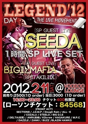 告知失礼いたします!! 2012年レジェンドSPの 一発目は、ラストライブで600人以上動員した【SEEDA】が今回も1時間ライブセットでやってきます!!そして、レペゼン九州シタキリナインから【BIG Iz'MAFIA】がレジェンド初参戦です!! そして今回は要望に応えて16時から23時までの夕方スタートのライブイベントです!!定員400名で行いますので、お早目にお願いします!! 詳細 《《LEGEND'12-THE LIVE MOVEMENT-》》 【日時】 2012.2.11(土) 16時OPEN〜23時CLOSE 【場所】 Voodoo Lounge 【料金】 2500円+1D 【ローソンチケ