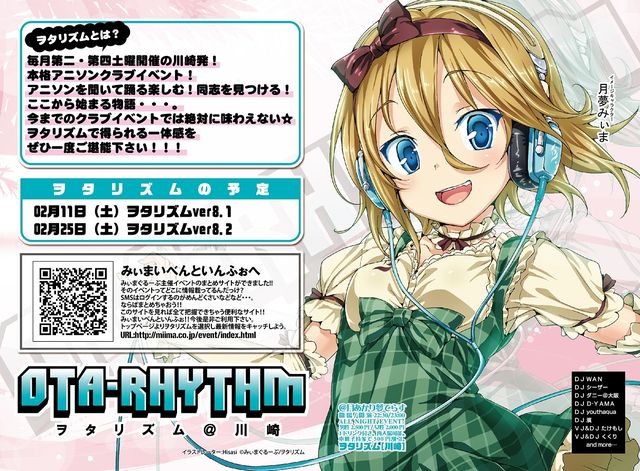 ヲタリズムver8.1@川崎 club 月あかり夢てらす ■■■お知らせ■■■ ・店舗の都合により、23:00〜開演の予定が、24:00〜開演へと変更となりました。 ご理解ご了承の程を宜しくお願い致します。 ・最近持ち込み(ドリンク等)が多々見受けられます。ダメぜったい! ・入場をスムーズに行う為、参加表明した際のコメントを携帯にて掲示して頂きます。 ■■■各種物販■■■ ・ヲタリズム月夢みぃまフルグラフィックTシャツ \5000(税込) ・各種Tシャツ(wdr.miima) \3500(税込み)〜 http://tsukiyume.com/bar/ ・みぃまチャリ