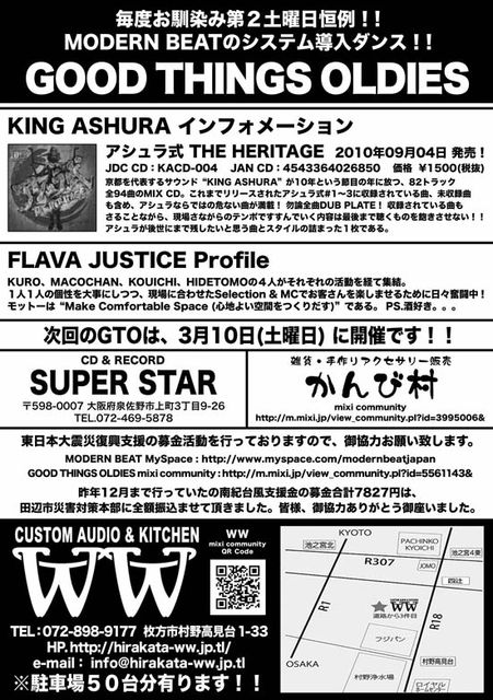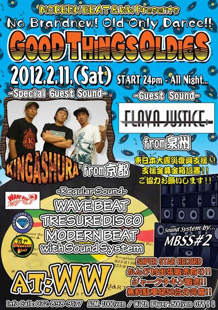 毎月第2土曜に、MODERN BEATサウンドシステムを導入して開催中のオールドオンリーダンス! 2月は、京都からスペシャルゲストに“KING ASHURA”、泉州からゲストに“FLAVA JUSTICE”と珍しい組み合わせでお届けします!!! No Brandnew! Old Only Dance!! GOOD THINGS OLDIES 2012.2.11(土) at:WW -Special Guest Sound- KING ASHURA from 京都 -Guest Sound- FLAVA JUSTICE from 泉州 -Regular Sound- WAVE BEAT TREASURE DISCO MODERN BEAT with Sound System -Sound System- MODERN BEAT SOUND SYSTEM #2 -出張販売- SUPER STAR RECO