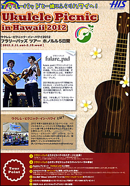 皆様、ALOHA♪ いつもお世話になっております♪ ウクレレショップOhanaでございます。 本日はとても面白い企画へのご参加者様募集の お知らせです♪♪♪詳細は下記をご覧下さいませ♪♪♪ ------------------------------------- 【フラリーパッドとウクピクハワイ2012へ♪♪♪】 2012年もハワイ、オアフ島にて ウクレレ・ピクニック・イン・ハワイ2012が開催されます♪ なんと!!!今回はfulare_pad「フラリーパッド」のお二人と 一緒に関空からハワイへ行きませんか!?!?!?!?! という面白い企画のウクレレ旅行のお誘いです♪♪♪ フラリ