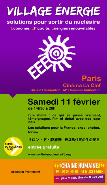 パリのLA CLEFという映画館で来月11日に行われる、脱原発ネットワーク・パリ主催のイベントの案内です。福島ついての情報交換、映画上映、写真展のほか、来る3月11日(日曜)リヨンからアヴィニヨンをつなぐヒューマンチェーンについての説明会などを予定しております。お時間ある方、いらっしゃいませんか?開催時間中の出入りは自由です。興味ある知り合いにもお声をかけてみてください。終日、日本人スタッフも数人います。それでは、よろしくお願いします。
