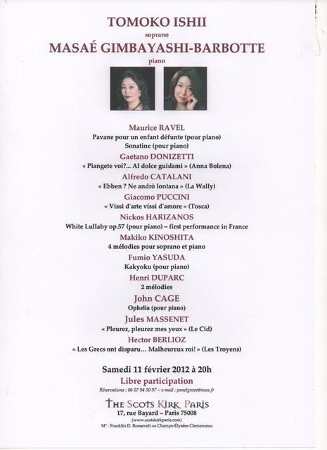 2/11 パリ8区 Scots Kirk 教会 デュオリサイタル 20時開演 17,rue Bayard 75008 Paris http://www.scotskirkparis.com/ 石井友子 ソプラノ バルボット成江 ピアノ ラヴェル、ジョン・ケージ、ハリザノス、安田のピアノ作品 ドニゼッティ、カタラーニ、プッチーニ、木下、デュパルク、マスネー、ベルリオーズの歌曲 入場自由参加 終了後にお飲み物を用意してございます。 ご予約 06 07 94 50 97 - e-mail : psnelgrove@noos.fr 石井友子公式ブログ http://tsmylpj.exblog.jp/ バルボット成江サイト http://www.m