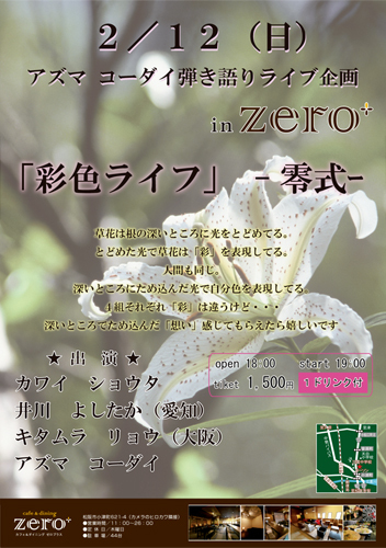 アズマコーダイ企画のスペシャルライブです 他県からもゲストが駆けつけてくれます みなさんお誘い合わせの上、ご来場宜しくです 【アズマコーダイ弾き語りライブ】 「彩色ライフ」 -零式ー ★★出演★★ カワイ ショウタ 井川 よしたか(愛知) キタムラ リョウ(大阪) アズマ コーダイ open 18:00 start 19:00 チケット 1,500円(1ドリンク付)
