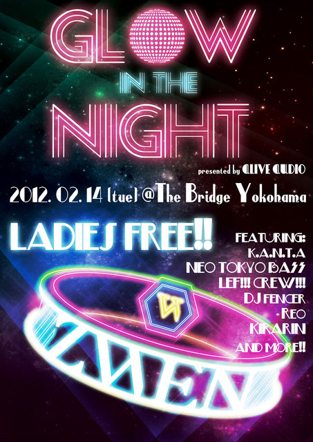今年10周年を迎えたALIVEが、2012年最初にお届けするパーティーがこの「GLOW IN THE NIGHT」!! おしゃれ健康ブレスレット、ZWEN TITANIUMを大フィーチャーしたこのイベントに相応しく、ALIVE/ZWENと同じスピリットを持った豪華なアーティストが参加してくれます!他のパーティーでは決して見ることのできないこの豪華な共演を、是非あなたの目と耳で直に感じてください!