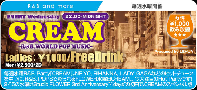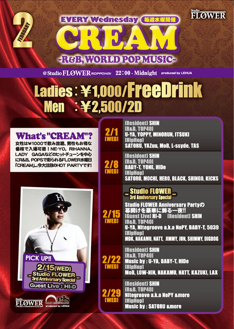 3周年記念初日スペシャル!! わたけんのゲストのわたけんと言っていただければ下記値段で入場できます!! ゲストは女性1000円飲み放題+シャンパンチケット, 男性2,000yen/2D+2S(ショッ ト)! ■2/15 Wed 22:00-Midnight R&B, Top40,and more CREAM [2月System] 男性♂2500yen/2Drinks 女性♀1000yen/FreeDrink [ALL Time] CREAM Anniversary special!! STUDIO FLOWeRが自信をもってお届けする3thAnniversary初日! メインフロアにはGUESTsingerにHI-Dを迎えてR&Bイベントにふさわしいひ