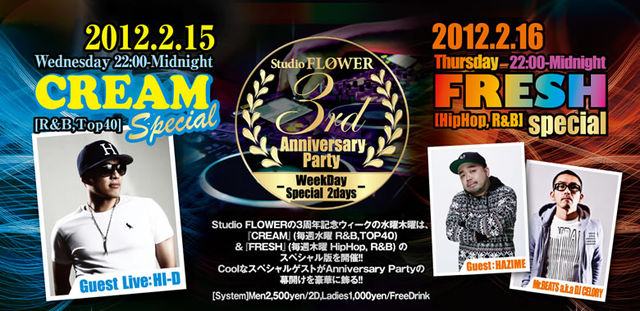 2/15(水) 毎週水曜開催 『CREAM』 FLOWER 3rd Anniversary special @六本木STUDIO FLOWER 簡単一言ゲスト入場 ★ショータロのゲストでショータロ★ と受付にて言って頂くと何名様でもゲスト料金で入場できます!! ★ゲスト料金★ 男性:¥2,000/2Drinks+2ショットガン 女性:¥1,000/飲み放題 [ALL NIGHT] +シャンパンチケット