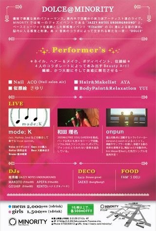優雅で華麗な美的パフォーマンス。県内外で活躍中の実力派アーティスト達のライブ。MINORITYでは唯一のジャズイベントであるJAZZY NOTES UNDERGROUNDとベースミュージックを基調とした新感覚イベントFiter80のDJ達による音の演出。脳内に入る感覚と刺激。美×音楽のコラボによって生まれる新たな一夜!