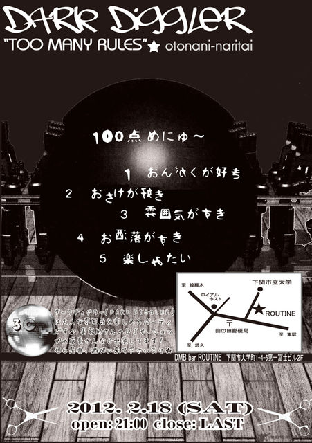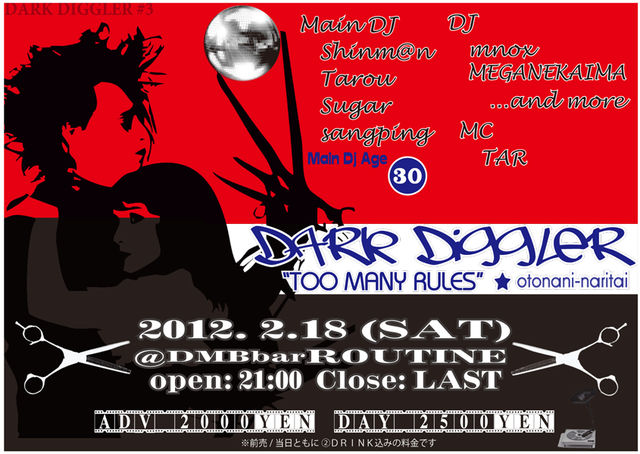管理人さま貴重なスペースをアリガトウございます★。 山の田の「DMB bar ROUTINE」でDJパーティを致します。 この機会に音楽とお酒と雰囲気を味わってみては!? 『DARK DIGGLER #3』 @ROUTINE MainDj: Shinm@n Tarou Sugar sangping DJ: AOG mnox MEGANEKAIMAN ……and more OPEN: 21:00-CLOSE: LAST TICKET ADV:2000yen DAY:2500yen ※ともに 2DRINK込みです。 ●ダークディグラー(DARK DIGGLER)は 大人な雰囲気を楽しめるD