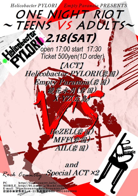 Helicobacter PYLORI & Empty Paranoia PRESENTS 『One Night Riot 〜Teens vs Adults〜』 OPEN 17:00 START 17:30 チケット 500円(1drオーダー【ソフトドリンクのみ300円】) 【ACT】 ☆Helicobacter PYLORI(岩国) ☆Empty Paranoia(岩国) ☆X-YZ(広島) ☆鏡花水月(岩国) ☆AIL(岩国) ☆ReZEL(岩国) ☆MFF(岩国) and ☆Special ACT ×2