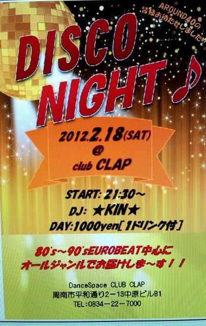 管理人様、告知失礼します。 2/18土曜に山口の周南(徳山)のクラブクラップで、 久々のディスコナイト開催で〜す。 懐かしいマハラジャでおなじみのユーロビートを 中心にオールジャンルで、夜9時半〜朝2時(予定)で、 入場料金は1000円です。 フロアは全面鏡張りで広くて踊りがいありますよ〜。 前日までならリクエストも受付ます。 周南市平和通り2−13中原ビル地下1階、TEL、0834-22-7000 すぐ近くの立体駐車場がおすすめです。 ピピ510. 所在地. 周南市糀町117. 概要 【収容台数】 510台 【営業時間】
