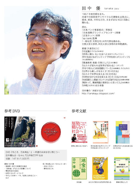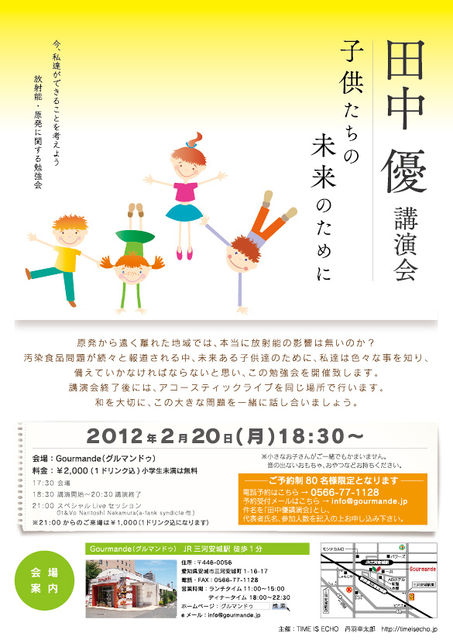 子どもたちの未来のために、子どもたちを守るためにどうしたらいいか? 先着80名様です!お申し込みはお早めに♪ 優さんの講演会のあとに素敵なライブもあります。 ご都合つく方はぜひご参加ください★ ----------------------------------------------------- 原発から遠く離れた地域では、本当に放射能の影響は無いのか? 汚染食品問題が続々と報道される中、未来ある子供達のために、私達は色々な事を知り、備えていかなければならないと思います。 「田中優」さんを迎え、勉強会を開催致します。 2月20日(月) 17:30