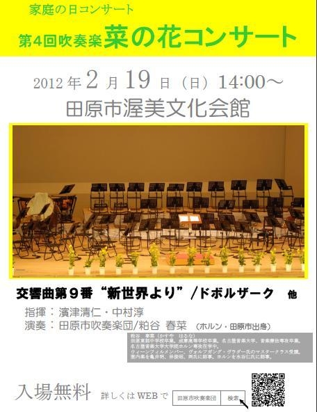 皆様のおかげをもちまして、何とか無事終了することができました。 ありがとうございました。 家庭の日コンサート 2012年2月19日 14:00〜 田原市渥美文化会館 ドボルザーク 交響曲第9番”新世界より” 他