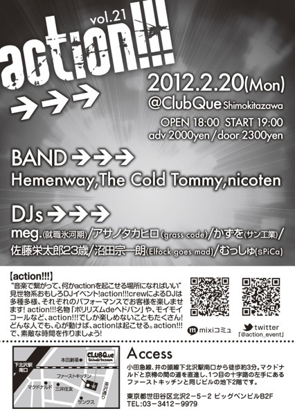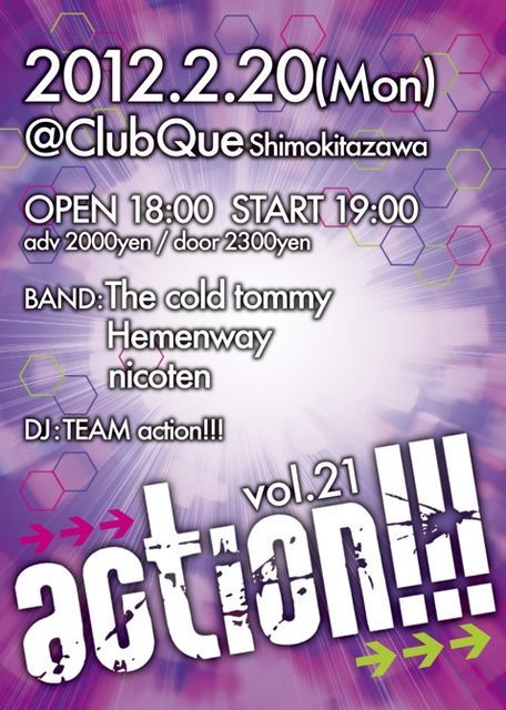 nicotenコミュの皆様こんにちは。 nicoten出演イベントの告知失礼します。 普段はDJイベントとして下北沢を中心に開催しておりますaction!!!というイベント、今回はライブ企画を開催することになりました。 ギターロックの甘口・中辛・辛口。そんな感じのラインナップになりました!!! 平日ですが良い音楽で楽しい一日にしましょう!!! ***************************** action!!!vol.21 2012.2.20(MON) @下北沢CLUB QUE OPEN 18:00/START 19:00 Adv 2000yen/Door 2300yen BAND:The cold tommy/Hemenway/nicoten