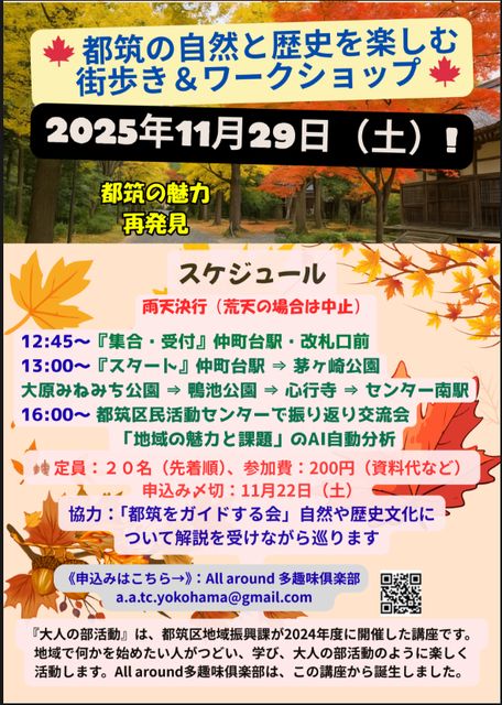 ½©¤ÎÅÔÃޤγ¹¤ò½ä¤ë¥Ä¥¢¡¼¤Ë»²²Ã¤·¤Æ¤ß¤Þ¤»¤ó¤«¡© ¹ÈÍÕ¤ò³Ú¤·¤à¥Ä¥¢¡¼¤Î»²²Ã¼ÔÊç½¸Ãæ¤Ç¤¹¡£ ÅÔÃޤμ«Á³¤ÈÎò»Ë¤ò´¶¤¸¤ë¡Ö³¹Ê⤭¡õ¥ï¡¼¥¯¥·¥ç¥Ã¥×¡×¤ò 11·î29Æü¡ÊÅÚ¡Ë ¤Ë³«ºÅ¤·¤Þ¤¹¡£ÀìÌ祬¥¤¥É¤È¥Õ¥¡¥·¥ê¥Æ¡¼¥¿¡¼¤¬Æ±¹Ô¤·¡¢¹ÈÍÕ¤ÎÈþ¤·¤¤ÎÐÆ»¤òÊ⤭¤Ê¤¬¤é¡¢ÅÔÃÞ¤ÎÌ¥ÎϤòºÆÈ¯¸«¤¹¤ë½©¤ÎÆÃÊÌ¥×¥í¥°¥é¥à¤Ç¤¹¡£¡Ê¼çºÅ¡ÖAll around ¿¼ñÌ£俱³ÚÉô¡×¡Ë ÅÔÃÞ¶è¤Ë¤Ï¡¢¡Ö¤µ¤µ¤Ö¤Í¤Î¤ß¤Á¡×¤ä¡Ö³ý¥öºê¸ø±à¡×¤Ê¤É¡¢»Íµ¨ÀÞ¡¹¤Î¼«Á³¤¬³Ú¤·¤á¤ëÎÐÆ»¥Í¥Ã¥È¥ï¡¼¥¯¤¬¹­¤¬¤Ã¤Æ¤¤¤Þ¤¹¡£ÈÕ½©¤ÎÎÐÆ»¤Ï¡¢À֤䲫¶â¤Ë¿§¤Å¤¯ÌÚ¡¹¤¬¥È¥ó¥Í¥ë¤Î¤è¤¦¤Ë³¤­¡¢¤Þ¤ë¤Ç³¨²è¤ÎÃæ¤òÊâ
