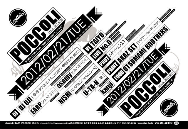 POCCOLI a.k.a. JB'S NITE 2012年2月21日(火) at club JB'S OPEN 19:00 Door: 1,500+1ドリンク ADV: 1,500円+2ドリンク 先着でオリジナルステッカーをプレゼント。 DJ: DJ UJI (音魂SOUND FACTRY/音韻王者Rec.) asamy (ETUDE/gily*) NiSHi (Garrot NAGOYA) U-TA-N (T.O.S) EARP (AKAZ SET) kanji VJ: TAIYO BAND LIVE: No.8 PAINT LIVE etc: AKAZ SET (EARP+Hi6+Huzer) PHOT: ハヤシシュンスケ FREE FOOD: OTSUMAMI BROTHERS