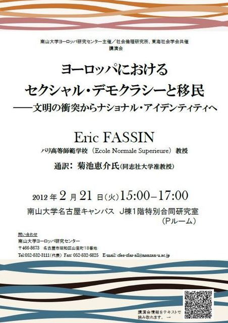 ●ヨーロッパにおけるセクシュアル・デモクラシーと移民 文明の衝突からナショナル・アイデンティティへ 日時:2012年2月21日(火)15時〜17時 場所:南山大学名古屋キャンパスJ棟1階Pルーム http://www.nanzan-u.ac.jp/Information/access.html#01 主催・問い合わせ: 南山大学ヨーロッパ研究センター(052-832-3111) 社会倫理研究所 東海社会学会 講演者:エリック・ファッサン(Eric FASSIN) パリ高等師範学校教授 通訳:菊池恵介氏(同志社大学准教授) 講演をされるエリックファッサン氏は、 同性愛差別、女性差別、人種差別に関し