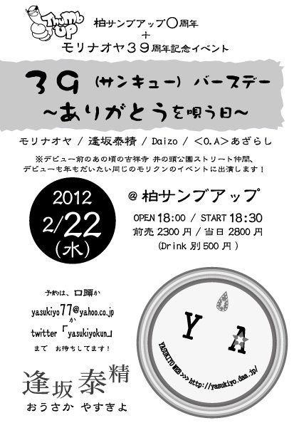 「39(サンキュー)バースデー〜ありがとうを唄う日〜」 2/22(水)@柏サンブアップ http://www.kashiwa-thumbup.com/ OPEN18:00 / START18:30 前売2300円 / 当日2800円 (D別500円) モリナオヤ / 逢坂 泰精 / Daizo / <O.A>あざらし 当時の井の頭公園の路上ライブ仲間でもある 同世代のモリナオヤくん企画のライブです♪ 予約は、 口頭か yasukiyo77@yahoo.co.jp か twitter「yasukiyokun」 まで お待ちしてます! 【柏ThumbUp】 〒277-0022千葉県柏市泉町17-25イシドビル1F TEL04-7168-8822 FAX04-71