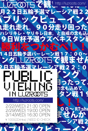 管理人様、貴重なスペース失礼致します。 2012年2月22日水曜日に千葉・柏LUZROOTSにてロンドンオリンピック・アジア最終予選、日本vsマレーシアのパブリックビューイングを開催させていただきます。今回の試合はロンドンオリンピック出場に向けて大事な一戦となります。この大事な一戦をご一緒に応援しましょう!!他では味わえない大画面スクリーンと迫力のサウンドでお楽しみいただけます。 ↓↓ 詳細はこちら ↓↓ LUZROOTS presents 〜ロンドン五輪 アジア最終予選Public Viewing〜 日本 vs マレーシア LUZROOTSがお届けする「ロ