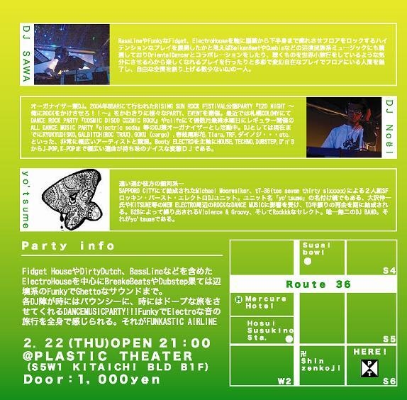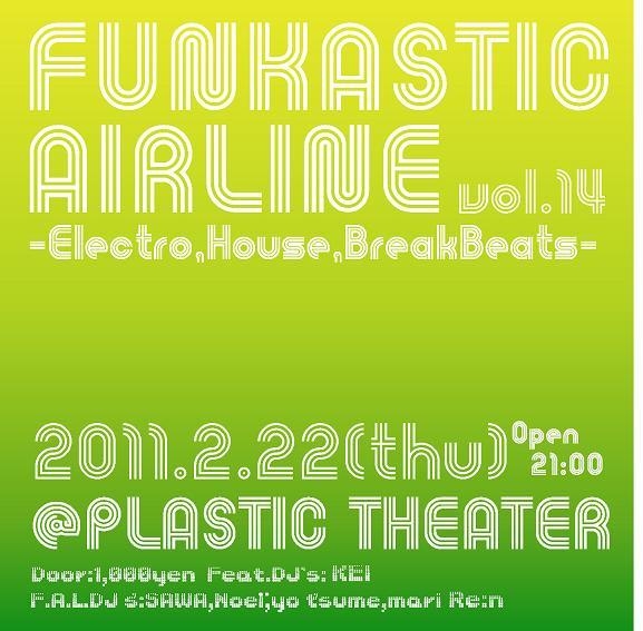 いつもお世話になっています。 告知ヨロシクお願いします 2/22(火)は毎月最終火曜日恒例、FUNKASTIC AIRLINEです★★ かなりアツイ、ヤバイ音を響かせます! ElectroからTribalまで、音の旅に出かけましょう♪ 是非是非遊びに来て下さい! FUNKASTIC AIRLINE Vol.14 -Electro,House,BreakBeats,- 2/22(火) OPEN/21:00 @PLASTIC THEATER(S5W1 KITAICHI BLD B1F) Door:\1000 Feat.DJ KEI F.A.L.DJ's SAWA Noёl yo'tsume Mari Re:N -Partyinfo- Fidget HouseやDirtyDutch、BassLineなどを