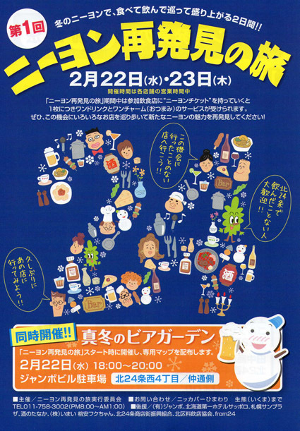 明日の22日、北24条で開催されるイベントです。 はしご酒の様な43軒の飲食店の中から好きな4軒に行って楽しむ「ニーヨン再発見の旅」のスタートは真冬のビヤガーデンです。 気が向いたら待ってます