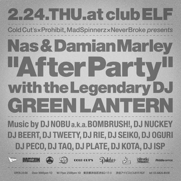 2/24木曜 @clubELF open 23:00 Nas & Damian Marley "After Party"を行います Guest DJはNas & Damian MarleyのバックDJを努める 【DJ Green Lantern】 そんなスペシャルイベントのmixiだけで取れるGUEST取得方法をお知らせいたします 料金は 男女共に2,000円/1D Guest希望者は ■代表者名 ■人数 をメッセージにてお願いします 当日は大変混雑が予想されます GUEST取得もお早めにお願いします 当日は18歳以