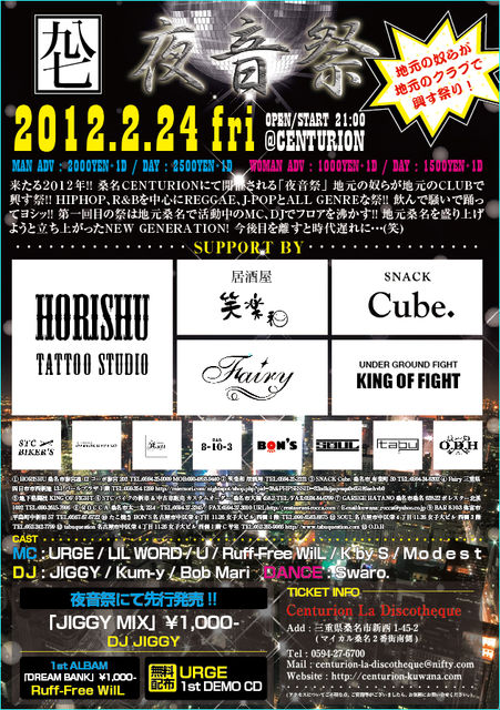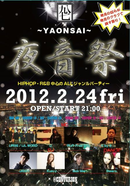 【夜音祭〜YAONSAI〜】 来たる2012年!! 桑名CENTURONにて開催される「夜音祭」 地元の奴らが地元のCLUBで興す祭!! HIP HOP、R&Bを中心にREGGAE、J-POPとALL GENREな祭!! 飲んで騒いで踊ってヨシッ!! 第一回目の祭は地元桑名で活動中のMC、DJでフロアを沸かす!! 地元桑名を盛り上げようと立ち上がったNEW GENERATION! 今後目を離すと時代遅れに・・・(笑) 【夜音祭〜YAONSAI〜】@ Centurion La Discotheque ・ 日時 2012,2,24 FRI Open / Start 21:00 ・ TICKET ・Adv MAN 2,000yen+1Drink WOMAN 1,000yen+1Drink