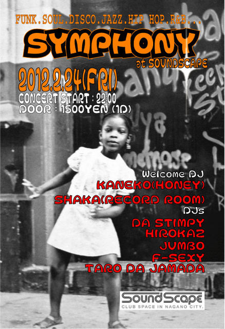 本日です! ブラックミュージックの熱い息吹きをお届けします!!! 2012/2/24(金) symphony@長野soundscape 22:00〜 [dj's] DA STIMPY HIROKAZ JUMBO F-SEXY TARO DA JAMADA [welcome dj's] KANEKO(HONEY) SHAKA(RECORD ROOM) [entrance fee] \1500(1d)