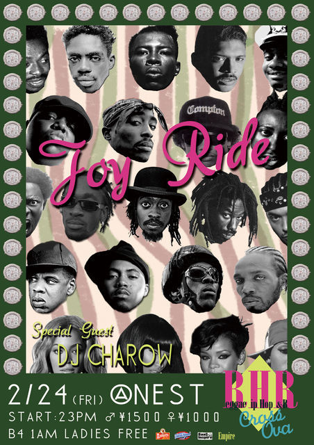 2/24(FRI) @NEST(コザミュージックタウン1F) "JOY RIDE" OPEN/START 23:00 Men:\1500 Ladies:\1000 ※1時までに入場の女性は入場無料!! 毎月第四金曜日にnestで繰り広げられるParty="JOY RIDE" REGGAE R&B HIP HOP PARTY!!!! DANCEHALL REGGAEを中心に朝までParty Style! 今回のGUESTは"DJ CHAROW" 沖縄HIPHOPシーンの若手実力者として注目の彼, 90年代CLASSICはもちろん最新のTUNEまで幅広い選曲でJOYRIDE FRYDAYを 盛り上げる事間違い無し!! 今回は REGGAE×HIPHOP CROSS OVA STYLE!! すべての音楽好