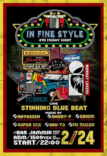 IN FINE STYLE 2月24日(金) 名護市 JAMMIN' http://www.jamming-45.com/about.html 0980-53-4523 22:00 ~ 1500YEN STINKING BLUE BEAT (LIVE) HAYASSEN (fr Totalize Naoya) Daddy-P (Blue Beat Record) GRI GRI (Fire Squad) SUPER-IREIE (Monday Lovers) SHO-TA (Metro Bank) FU-RIMUN