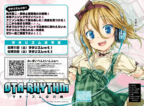 ヲタリズムver8.2@川崎 club 月あかり夢てらす ■■■お知らせ■■■ ・最近持ち込み(ドリンク等)が多々見受けられます。ダメぜったい! ・入場をスムーズに行う為、参加表明した際のコメントを携帯にて掲示して頂きます。 ■■■各種物販■■■ ・ヲタリズム月夢みぃまフルグラフィックTシャツ \5000(税込) ・各種Tシャツ(wdr.miima) \3500(税込み)〜 http://tsukiyume.com/bar/ ・みぃまチャリティーTシャツ \2100 (収益は全て震災義援金として寄付いたします) ■■■開催日■■■ 2012年02月25日 土曜日 ■■