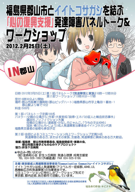 2011年度独立行政法人福祉医療機構助成社会福祉振興助成事業 「成人発達障害当事者の心の復興支援事業」 福島県郡山市とイイトコサガシを結ぶ「心の復興支援」 発達障害パネルトーク&ワークショップin郡山 第一部 発達障害パネルトーク 時間:10時〜12時30分(定員:80名) 【パネラー】 ?父親の立場から: 大泉実成 (作家) (講談社ノンフィクション大賞作品 「説得エホバの証人と輸血拒否事件」) http://d.hatena.ne.jp/oizumi-m/ ?母親の立場から: かなしろにゃんこ。 (漫画家) (代表作「うちの子はADH
