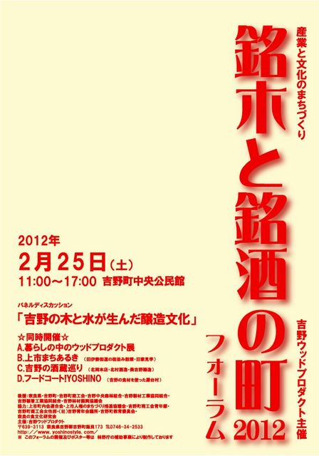 吉野町で、昨年に引き続き「銘木と銘酒の町フォーラム」が開催されます。 パネルディスカッション「吉野の木と水が生んだ醸造文化」 吉野町内循環バスでの、大和上市や酒蔵めぐり 上市町歩き 吉野の醸造フードコートなど 盛りだくさんです。 参加費は無料です。 詳しくはホームページをご覧下さい。 吉野ウッドプロダクトホームページ http://www.yoshinostyle.com/index.html 皆様のご参加をお待ちしています。