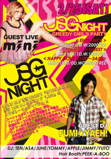 2月25日は109の人気アパレルブランド『JSG』とELFの看板イベント『INTER MIX』のコラボレーションイベント 『JSG NIGHT』が開催 スペシャルゲストライブには東京ガールズコレクション等のファッションイベントなどで活躍をしている『mini』 GUEST DJにはCDセールス史上、爆発的な人気を誇るメガ王子こと『DJ FUMI☆YEAH』が登場 B2メインフロアでは、ビルボードヒットを中心に、様々なジャンルのヒット曲のみで構成されたオールミックPARTY B1フロアでは都内で活躍中のDJによる最新のHIP-HOP,R&Bが