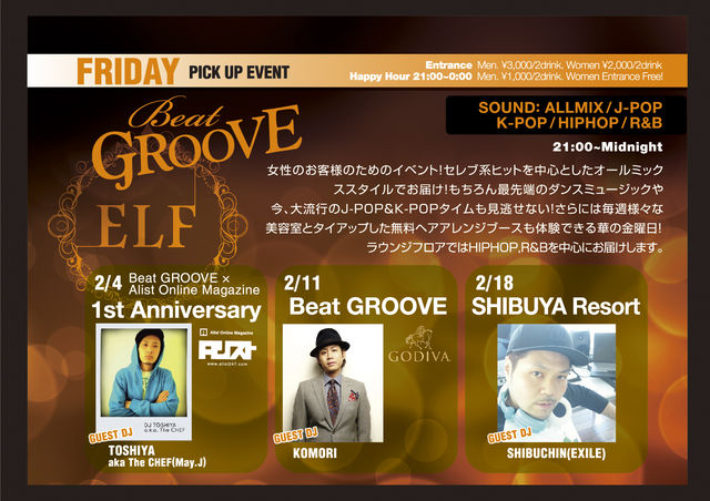 今週末、ELF金曜日のHOTなEVENT情報です☆ 金曜日のCLUB ELFは... 金曜日のELFはBEAT GROOVE 【ALL MIX】! セレブ系HITを中心としたALL MIXスタイルでお届け! もちろん最先端のダンスミュージックや今大流行のJ-POP&K-POPタイムも見逃せない!! そして毎週都内で超人気の様々な人気美容室とタイアップした無料へアアレンジブースも体験できる華の金曜日 ラウンジフロアではHIP-HOP,R&Bを中心にお届け致します。 MAIN DJ:ASA/TEN ZAWA/RYO KAZUNE/KAZUYA/JELLY/TANI TAKU/MI/HIROSHI/SHINOBU HIPHOP DJ:NARUMI/FOX/GO-ZIN
