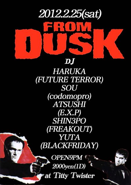 ●2/25 「from Dusk」 @TittyTwister 21:00 Start fee:2000yen/1drink DJ: HARUKA(FutureTerror/TwinPeaks) Sou(codomopro) ATSUSHI(E.X.P) Shin-3-po(Freak Out) Yuta(BlackFriday) <HARUKA> FUTURE TERROR/DJ。山形県鶴岡市出身。2003年に鶴岡から仙台へと拠点を移したのを期にDJを本格始動。初期はダブ、アンビエント、ポストロック、当 時のクリック・ハウスなどをプレイしていたが、その活動のなかでディープでしなやかなグルーヴが流れるテクノ/ハウスの現在のスタイルへと変遷していく。 日本各地をDJプレイで巡りながらも、