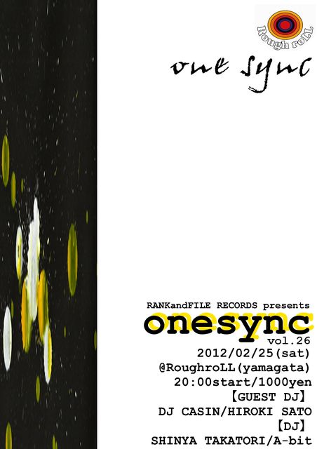 RANKandFILE RECORDS presents 『one sync』 vol.26 2012/02/25(土) @ Rough roLL (山形市七日町) 023-624-5420 pub open 19:00 / start 20:00 ... 1000yen 【GUEST DJ】 DJ CASIN / HIROKI SATO(STILL BLUE) 【DJ】 SHINYA TAKATORI / A-bit info: http://rankandfile.web.fc2.com/ ●DJ CASIN ファッションもとても重要だ。否定しない。 しかし、アイツが1枚5800円の新作Tシャツを 一喜一憂しながら選んでいる間に、 DJ CASINは数枚のレコードを買い、 数パターンのルーティーンを思いついている。
