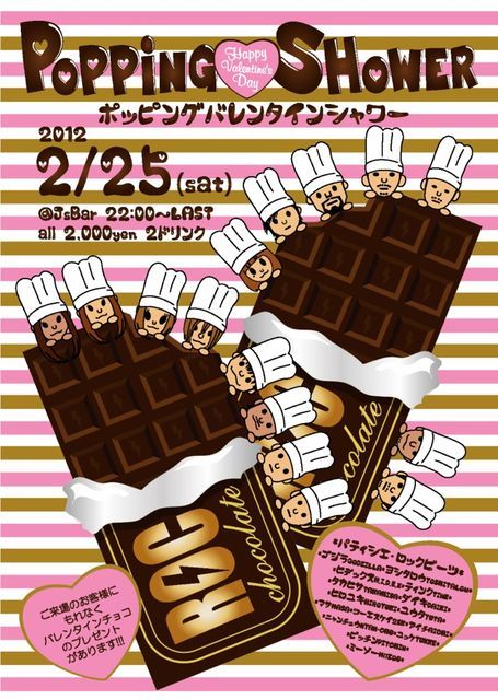 POPPINGVALENTINESHOWER 2月25日土曜日 @J'sBAR (山形駅前ホテルイーストワンBF) OPEN 22:00〜 ALL 2000円2D キャッシャーにポピシャコミュニティーorポピシャmixiページ提示で全員ディスカウント MENs 1500円2D LADY 1000円2D ポピシャコミュ http://mixi.jp/view_community.pl?id=2786892& 2月はバレンタインスペシャルって事で 遊びに来てくれた方にチョコレートプレゼント ROCBEAT