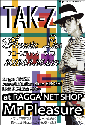 告知失礼します。 昨年の夏「平野」にOPENしたRAGGA NET STORE Mr Pleasureにて その甘いルックス、その甘いvoiceで人々を魅了する 「シュリルブンナ」でお馴染みの TAK-Z from Socrpion the silentkillerのAcoustic Liveが決定! 時は2012年2月26日(日曜日)の夕方の17:00〜LIVE START!! Acoustic Guitar を奏でるのはSKYLINE BANDのGuitarList Bluse HIROSHI! ご観覧は無料! 以下場所の詳細です。 RAGGA NET STORE Mr Pleasure 大阪市平野区流町1-6-8コーポ山忠101 info:::06-6709-5222 Mr Pleasure URL ::: http: