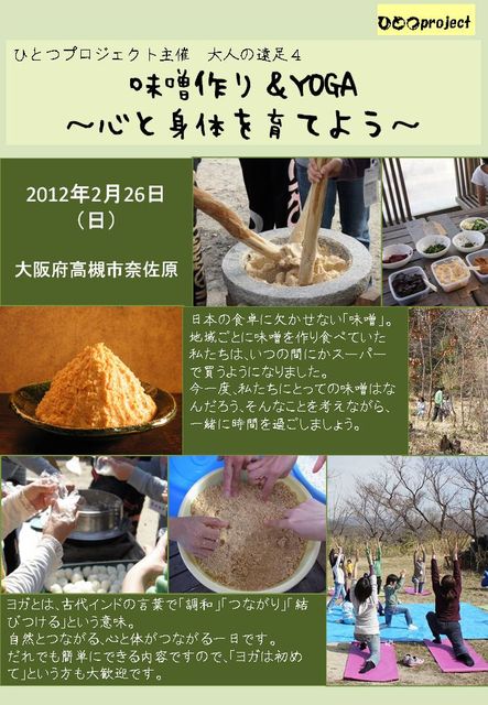 大好評、「大人の遠足」シリーズの第4段。 【味噌づくり】 味噌は、日本人の心と体に元気と安らぎを与えてくれます。 かつては、地域ごとの味を守りながら作られてきた味噌も、今では全国のスーパーに並び、味噌を作る伝統が失われかけています。 手間暇かかる味噌づくりも、みんなで一緒に作れば大丈夫。 2月に仕込んだ味噌は、9月に食べることができます。 菌たちがじっくり豆を醸すスピードを感じながら、一緒に味噌づくりをしましょう。 【ヨガ】 このイベントは、ただ味噌を作るのではありません。 自分の心と体を感じ