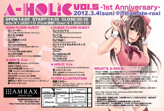 ■■■A-HOL!C vol.5 -1st Anniversary-■■■ 昨年開催されたA-HOL!C vol.1から1年間。 A-HOL!Cもいろいろなことがありました。 気付けば共に歩む仲間も増え、DJ・VJ・スタッフ陣の意識も一層高まり… 「より楽しく、より面白く、もっともっと素敵な時間を多くの人と共有したい!!!」 その思いを胸に。 今、成果を皆さんにお見せしたいと思います! 第5回は-1st Anniversary-! これを記念して、かつてない桁外れなゲスト達が渋谷に大集結! 「アニソンクラブイベント」の歴史を築き上げてきたベテランDJから、 斬新なプレイであ