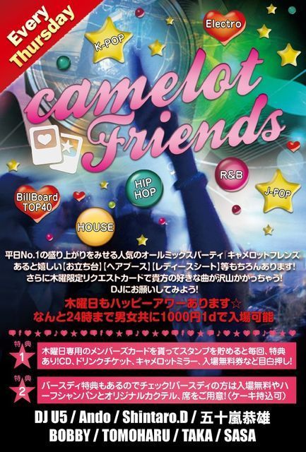 オールジャンルでメインフロアーで開催します 緊急に入りたい方、メッセージが苦手な方、入り口で五十嵐ゲストのキャメフレでもディスカウント対応可能です 「CAMELOT FRIENDS」とは... HIP-HOP, R&B, POPS, HOUSE, ELECTRO, J-POP, K-POP ジャンルレスに誰でも楽しめる新旧HIT曲中心に盛り上げます 木曜日では他のイベントにない特典満載 ☆フロアにDJブースを設置 普段フロアからは見る事の出来ないDJのPLAYの様子がバッチリみれます ☆リクエストカード有り 自分が好きな曲をリクエストカ