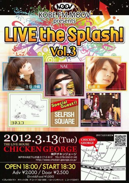 KOBE FM.MOOV presents 「LIVE the Splash! Vol.3」 【日時】2012年3月13日(火) 【場所】神戸 Chicken George(チキンジョージ) 【住所】神戸市中央区下山手通2-17-2-B1F 【TEL】 078-332-0146 【料金】前売り¥2000 / 当日¥2500 (飲食代¥1,000別途要) 【時間】開場 18:00/開演 18:30 【共演】Nae/寺島沙織/皿屋恵/EDEN/Selfish Square/ヨネユコ 【サポートメンバー】 西村守(Guitar) Neo(Bass) 吉村昇治(Drums) バンドLIVEです。 ぜひぜひ、よろしくお願いします。 【チケット販売】 ご予約フォーム http://m